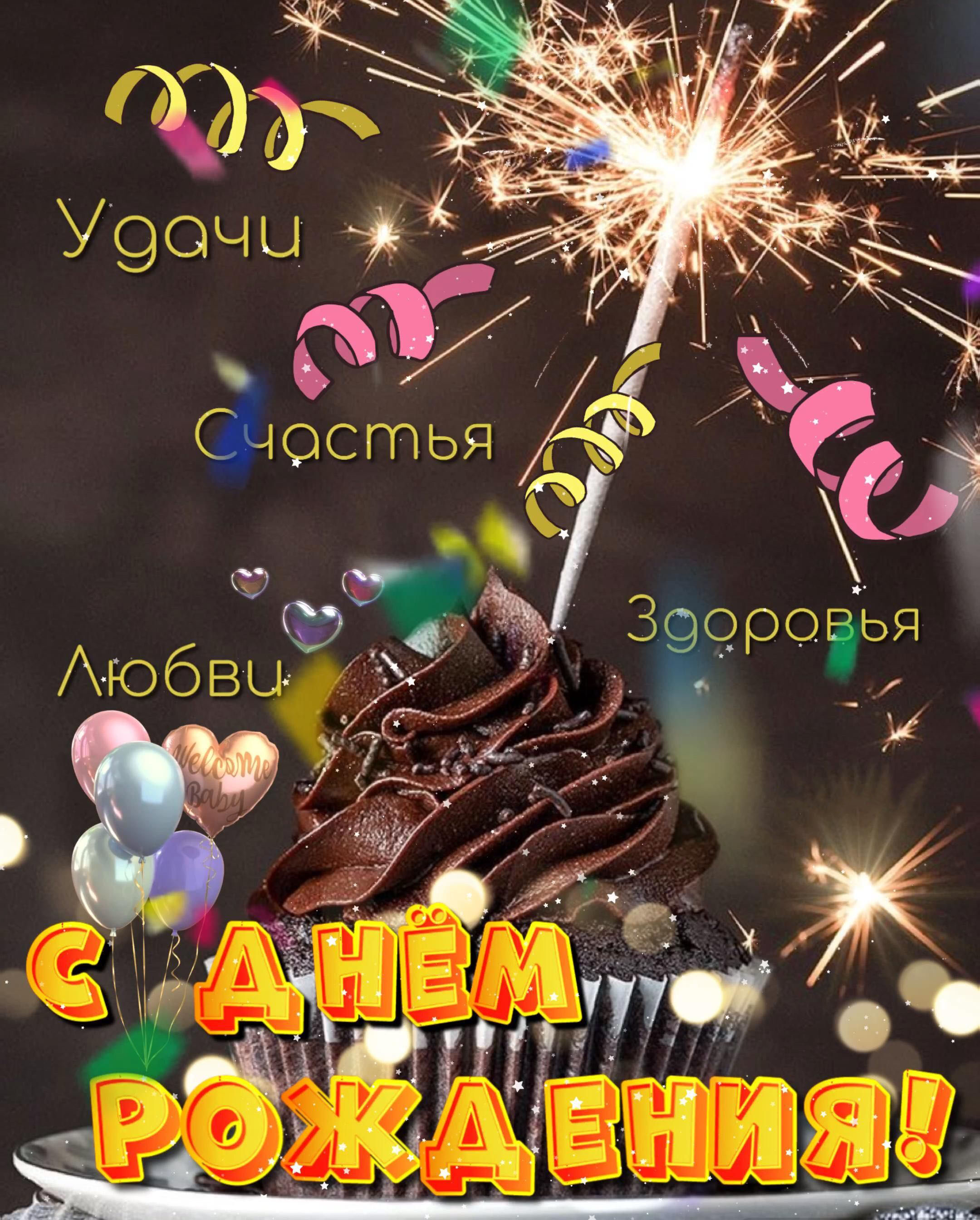 Открытка с днем рождения женщина. Пожелания, сладости, салют, шарики.