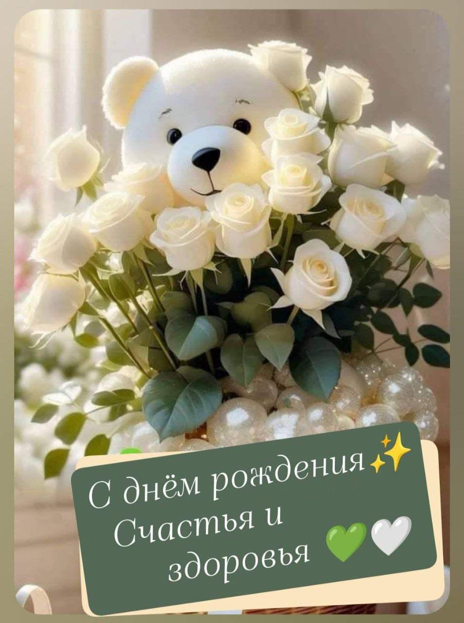 Открытка с днем рождения женщине. Мишка с белыми розами, пожелания счастья и здоровья.