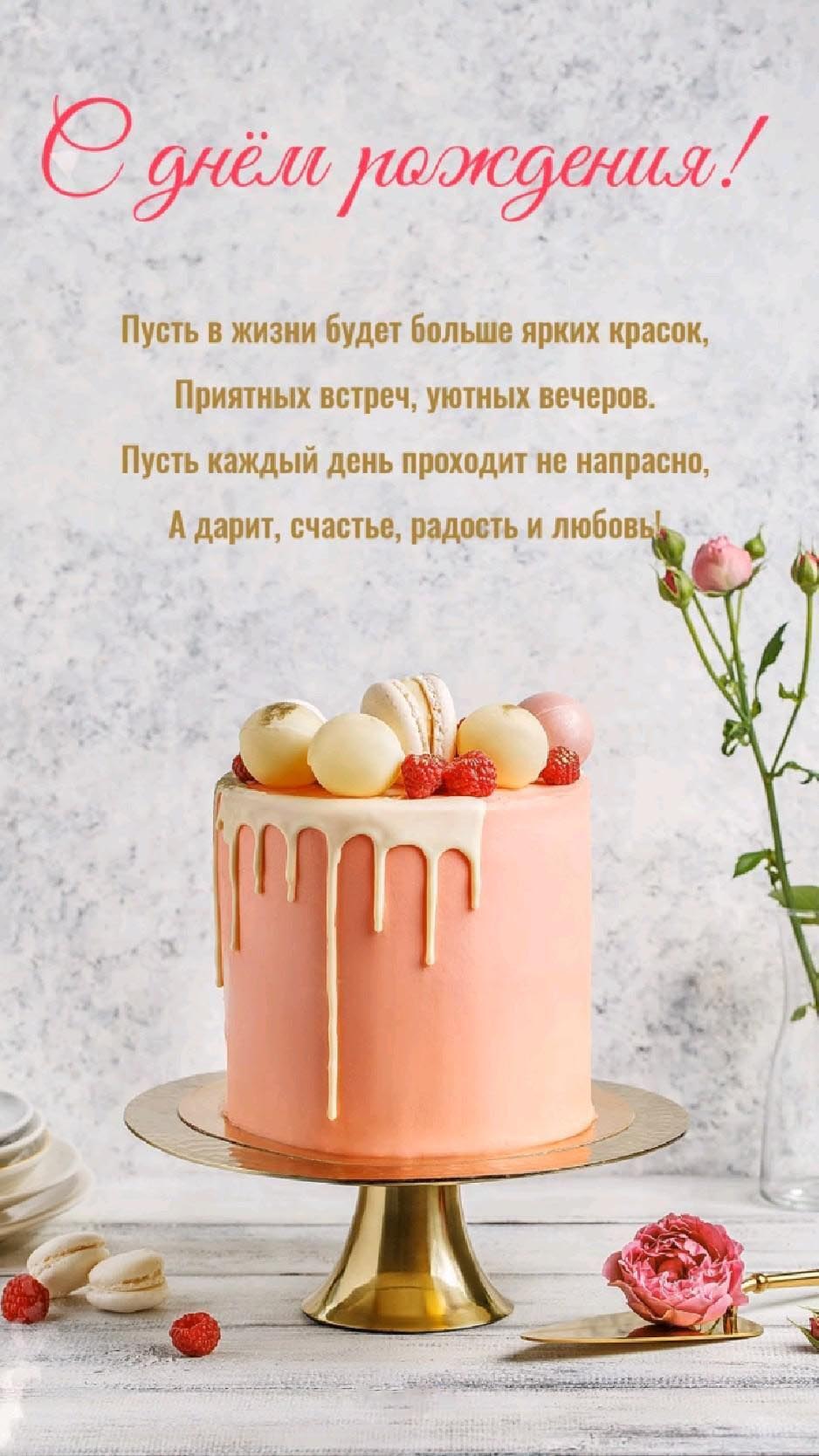 Открытка с днем рождения женщине. Пожелания, торт, цветы.
