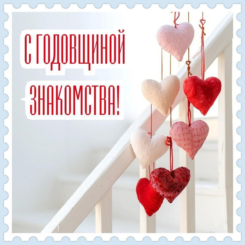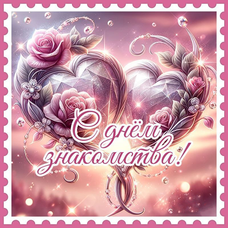 Открытка с днем знакомства в розовых тонах. Розовые розы и сердечки.