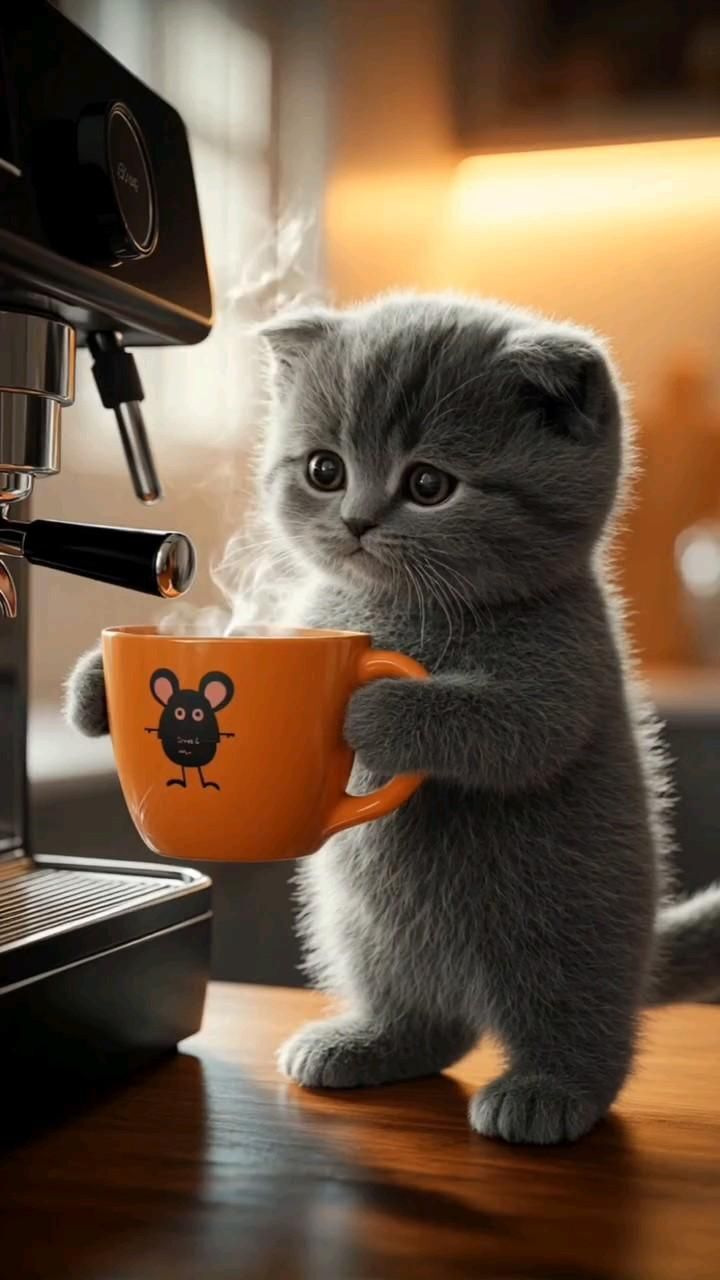 Открытка с добрым утром. Без текста. Котик наливает кофе.