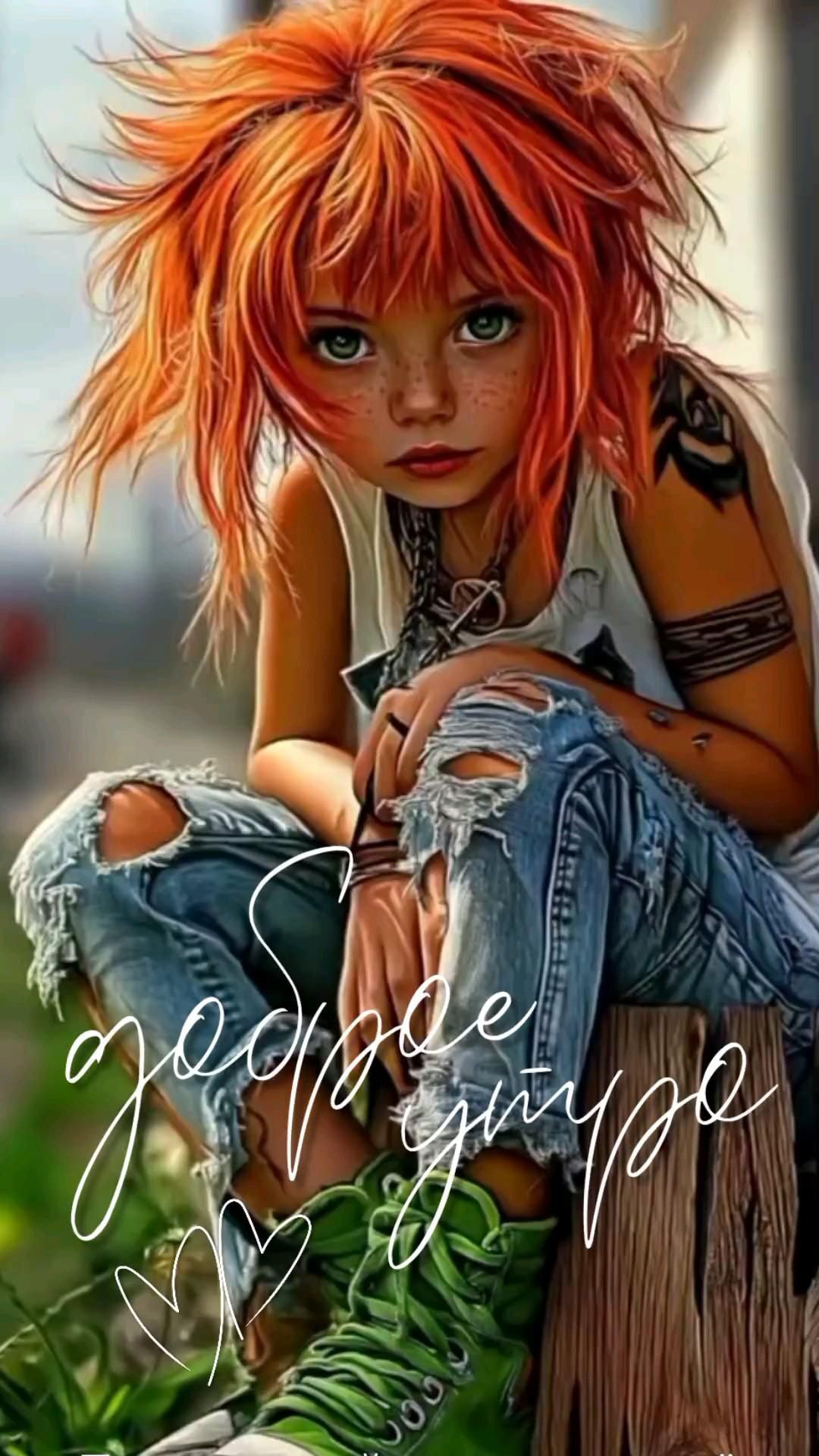 Открытка с добрым утром. Девочка с рыжими волосами.