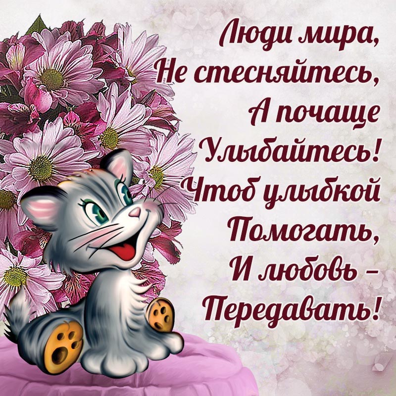 Открытка с добрым утром. Картинка с котиком и большим букетом цветов.