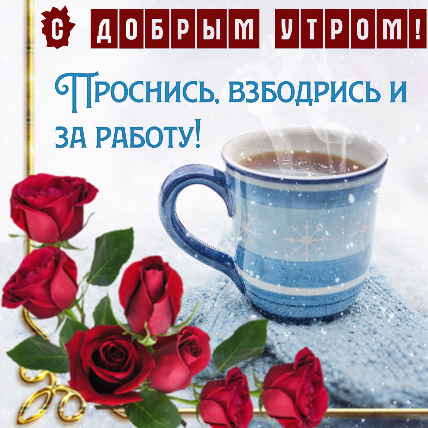 Открытка с добрым утром. Розы, пожелание, чашка кофе.