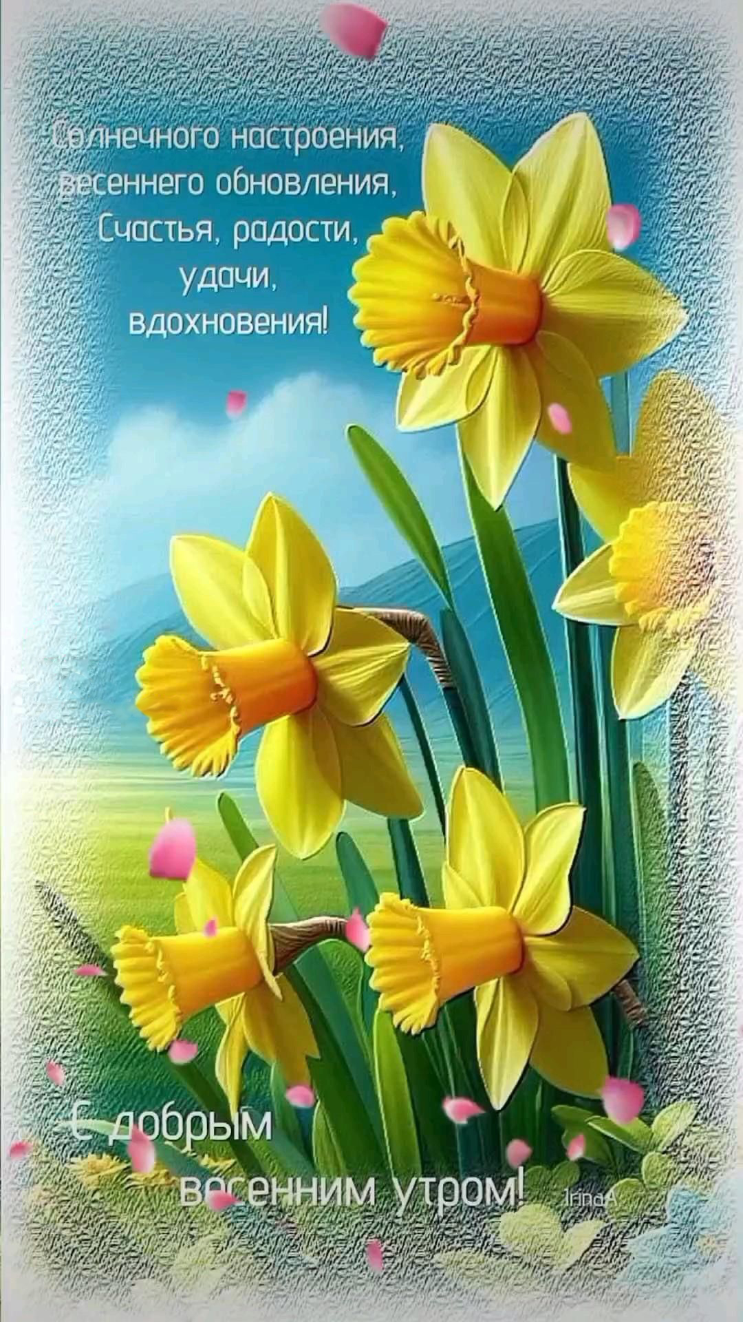 Открытка с добрым утром. С добрым весенним утром. Нарциссы, пожелания.