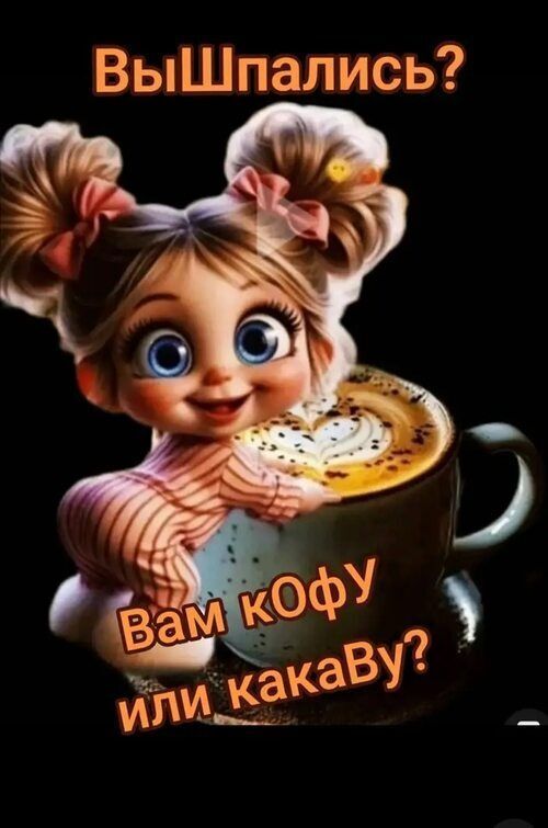 Открытка с добрым утром с юмором. Девочка и чашкой кофе.