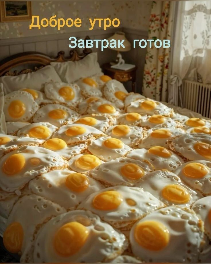 Открытка с добрым утром. Завтрак готов. Большая яичница.
