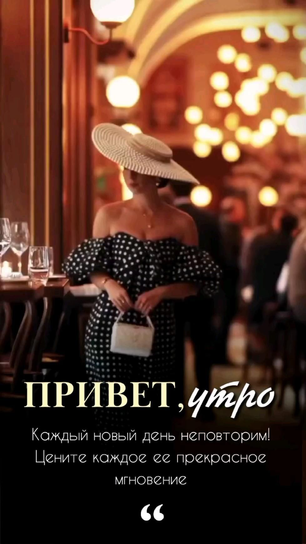 Открытка с добрым утром. Женщина в шляпке, пожелания.