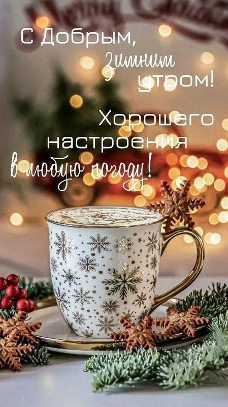 Открытка с добрым зимним утром. Пожелания и чашка с зимними украшениями.