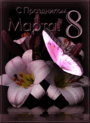 Открытка с Международным Женским Днем 8 марта gif анимационная мерцающая. Бабочка и цветы.