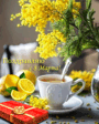 Открытка с Международным Женским Днем 8 марта gif анимационная мерцающая. Желтые цветы, чай с лимоном, конфеты.