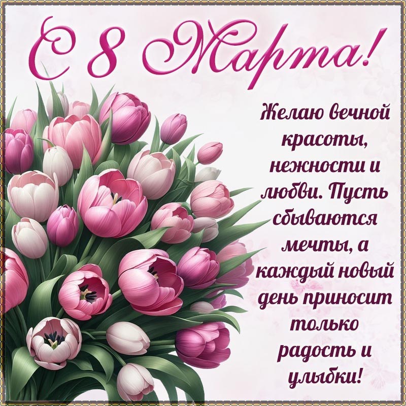 Открытка с Международным Женским Днем 8 марта. Открытка - хорошее пожелание на 8 Марта нежности, радости и улыбок.