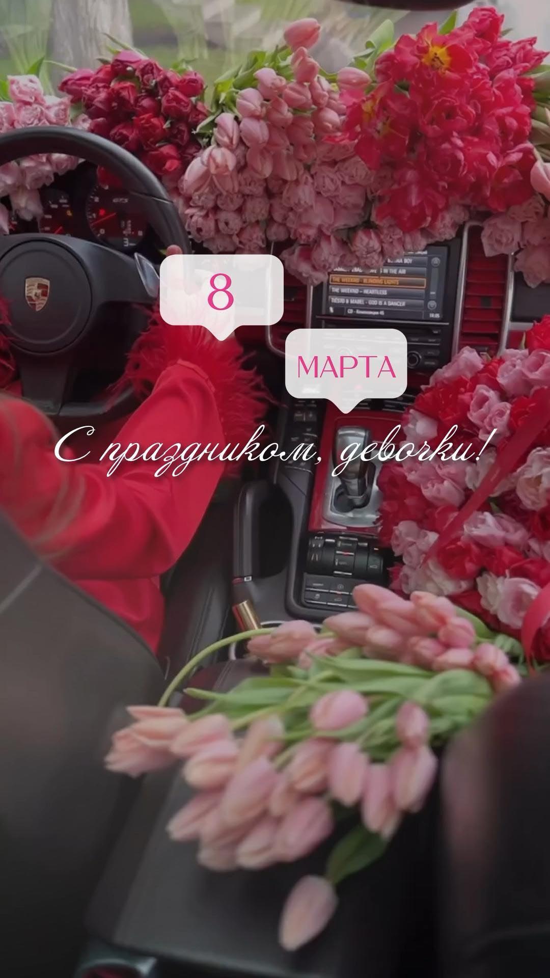 Открытка с Международным Женским Днем 8 марта. С праздником, девочки! Цветы в автомобиле.