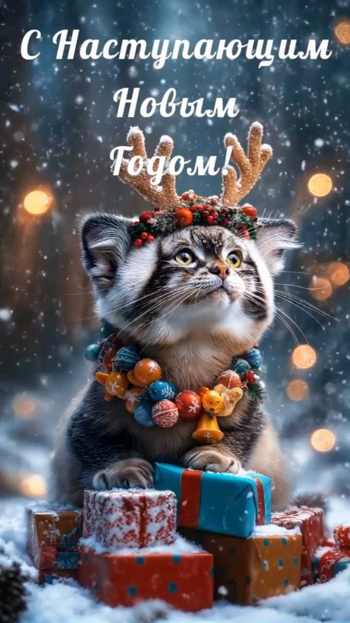 Открытка с Наступающим Новым годом. Котик с подарками и в шапочке с оленьими рогами.
