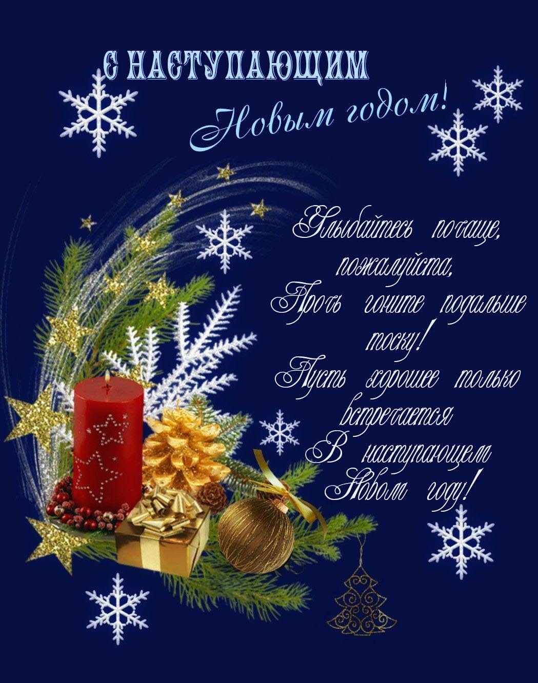 Открытка с наступающим Новым годом. Пожелания, снежинки, подарки.