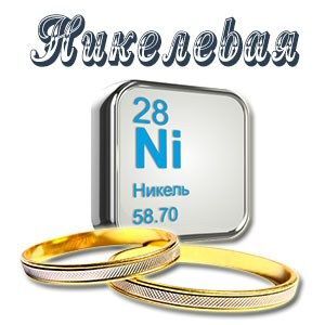 Открытка с никелевой годовщиной свадьбы. Химический элемент никель и обручальные кольца.