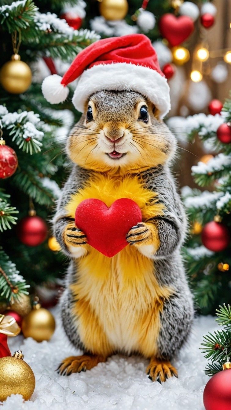 Открытка с Новым годом. Без текста. Для новогоднего настроения. Белочка с сердечком.
