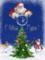 Открытка с Новым годом gif анимационная. Часы, Дед Мороз, елочка, снеговик, олень.