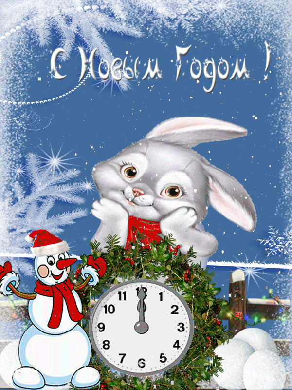 Открытка с Новым годом gif анимационная. Часы, зайчик, снеговик.