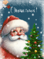 Открытка с Новым годом gif анимационная. Дед Мороз, ангелочек и елочка.