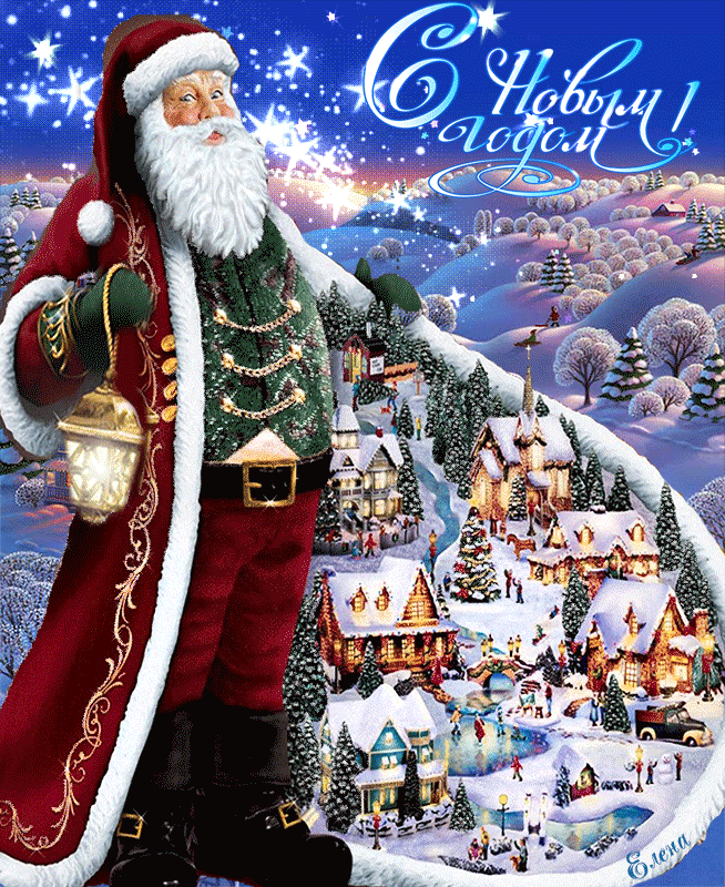Открытка с Новым годом gif анимационная. Дед Мороз. Заснеженный городок.