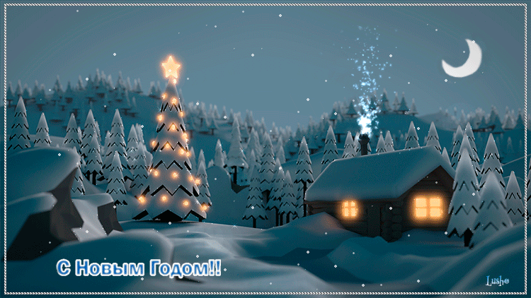 Открытка с Новым годом gif анимационная. Домик в снежном лесу. Елочка, месяц.