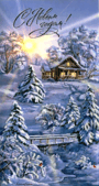 Открытка с Новым годом gif анимационная. Домик в заснеженном лесу.