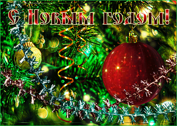 Открытка с Новым годом gif анимационная. Елочные шарики на ветках.