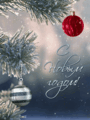Открытка с Новым годом gif анимационная мерцающая. Елочка с игрушками, снежинки.