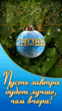 Открытка с Новым годом gif анимационная мерцающая. Шарик с Новым годом. Падает снег на фоне елочки, пожелания.