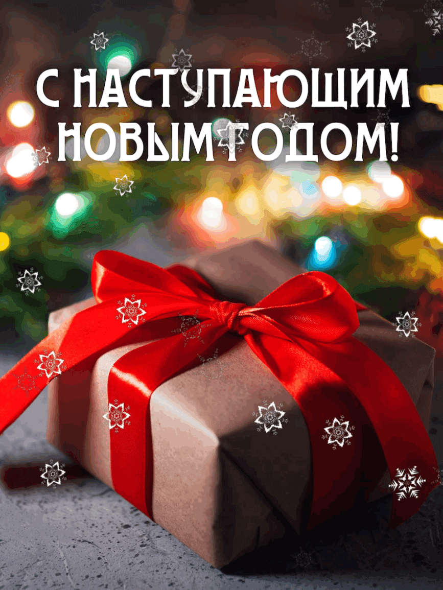 Открытка с Новым годом gif анимационная. С наступающим Новым годом. Подарок и падающие снежинки.