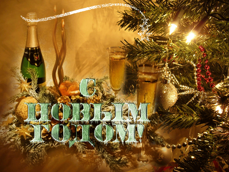 Открытка с Новым годом gif анимационная. Шампанское, елочка.