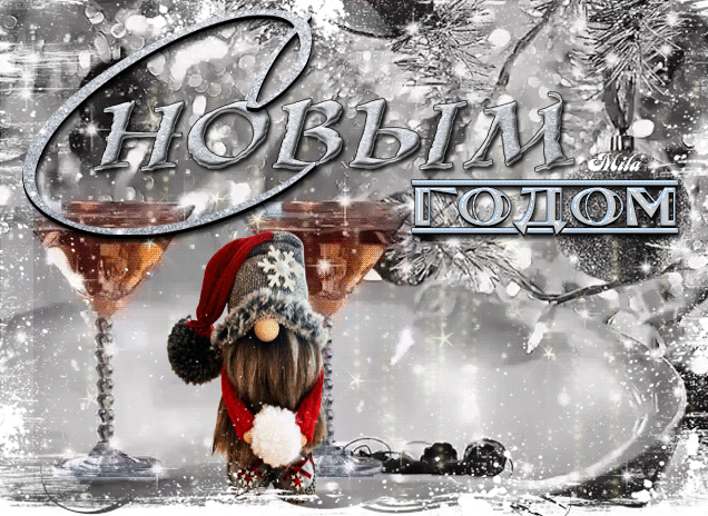 Открытка с Новым годом gif анимационная. Шампанское, снег идет.