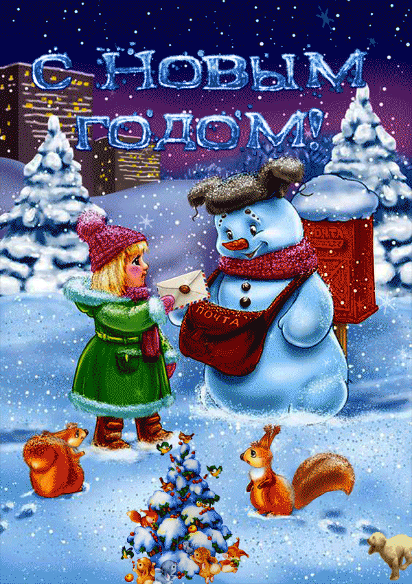 Открытка с Новым годом gif анимационная. Снеговик-почтальон и девочка.