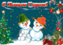 Открытка с Новым годом gif анимационная. Снеговики, елочка и подарки.
