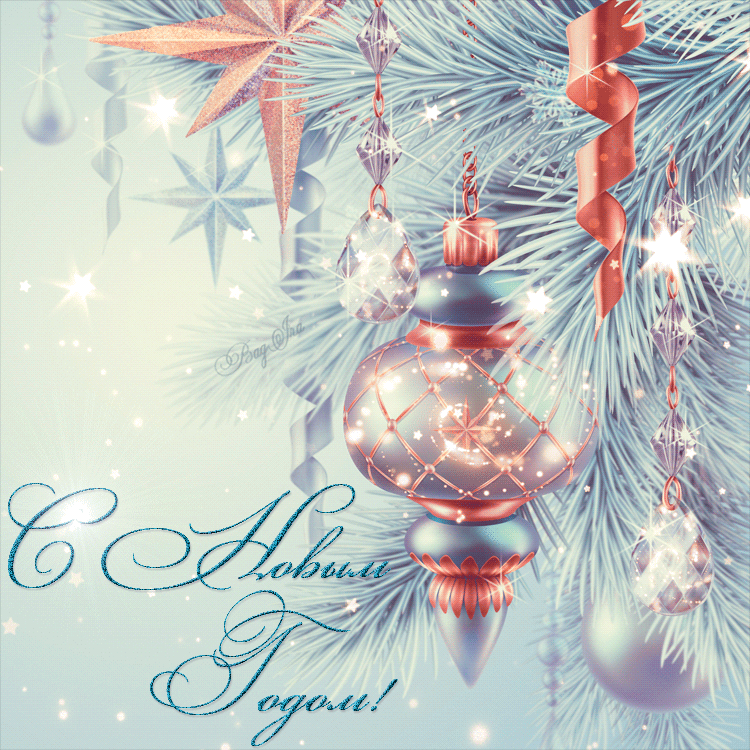 Открытка с Новым годом gif анимационная. Сверкающие елочные украшения.