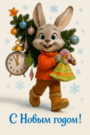 Открытка с Новым годом gif анимационная. Зайчик с елкой в ретро стиле.