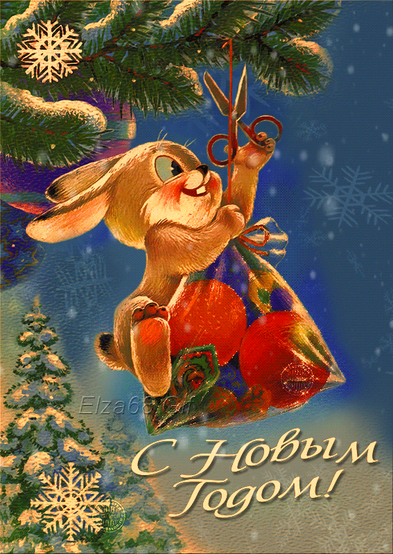 Открытка с Новым годом gif анимационная. Зайчик забирает подарок.