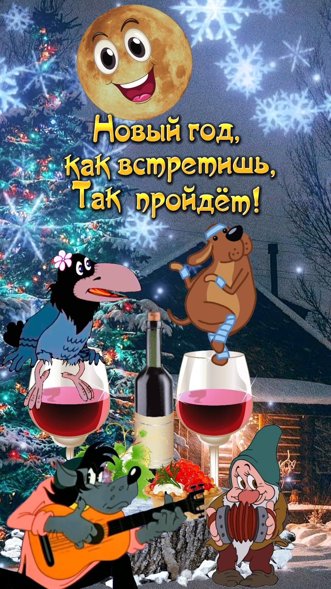 Открытка с Новым годом. Как встретишь, так пройдет! Мультяшные герои с юмором.