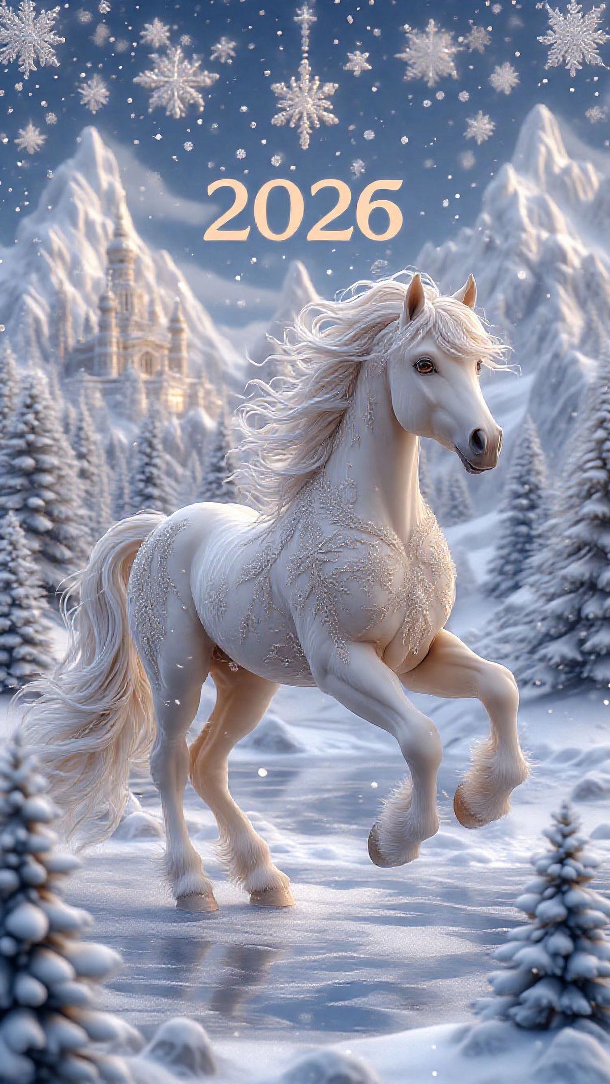 Открытка с Новым годом лошади 2026. Белая красивая лошадь в зимнем лесу с замком.