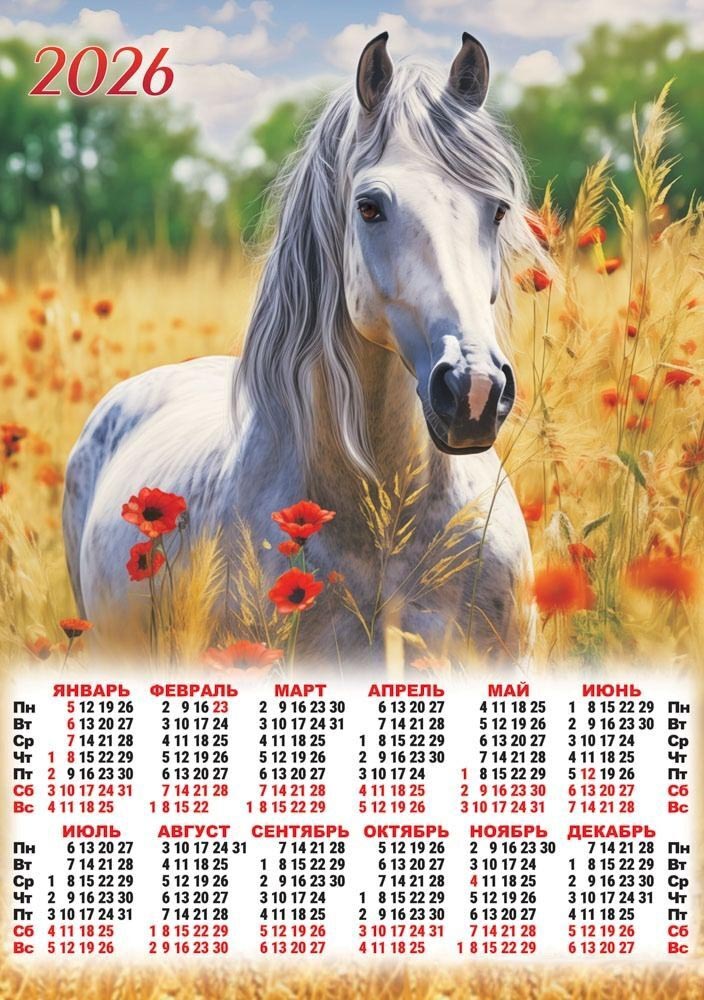 Открытка с Новым годом лошади 2026. Календарь на 2026 год с лошадью на маковом поле.