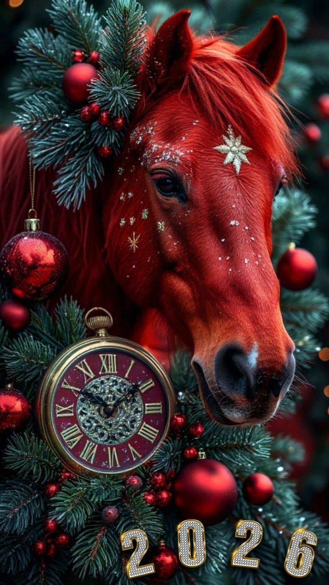Открытка с Новым годом лошади 2026. Красная лошадь и елочка.
