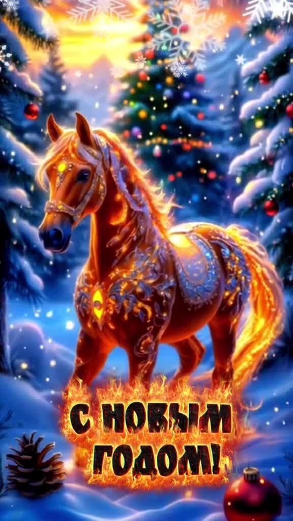 Открытка с Новым годом лошади 2026. Огненная лошадь в зимнем лесу.