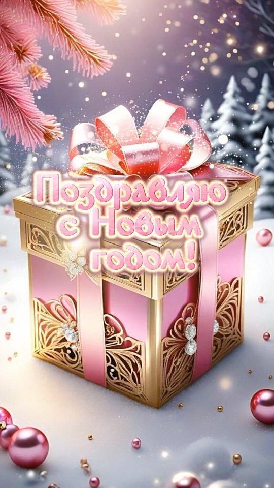 Открытка с Новым годом. Поздравляю с Новым годом. Подарок и зимний лес.