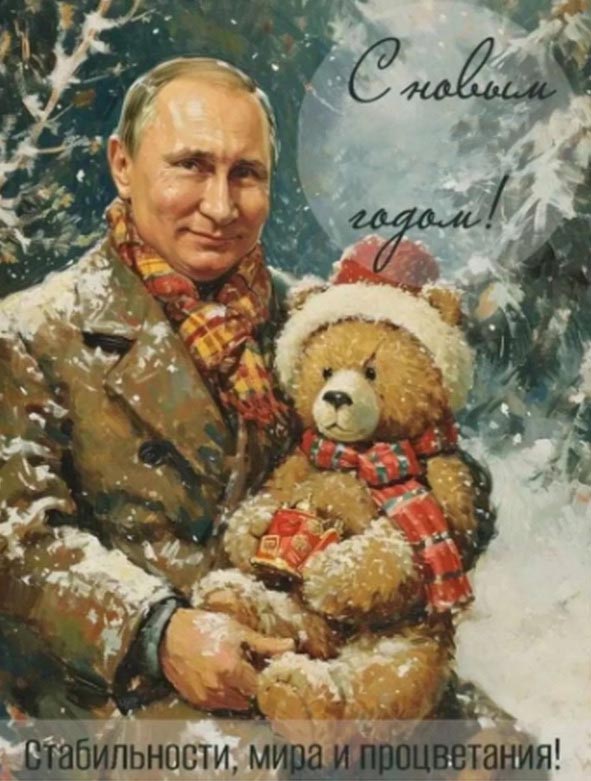 Открытка с Новым годом. Путин поздравляет с Новым годом с игрушечным медвежонком. Официальное поздравление коллегам.