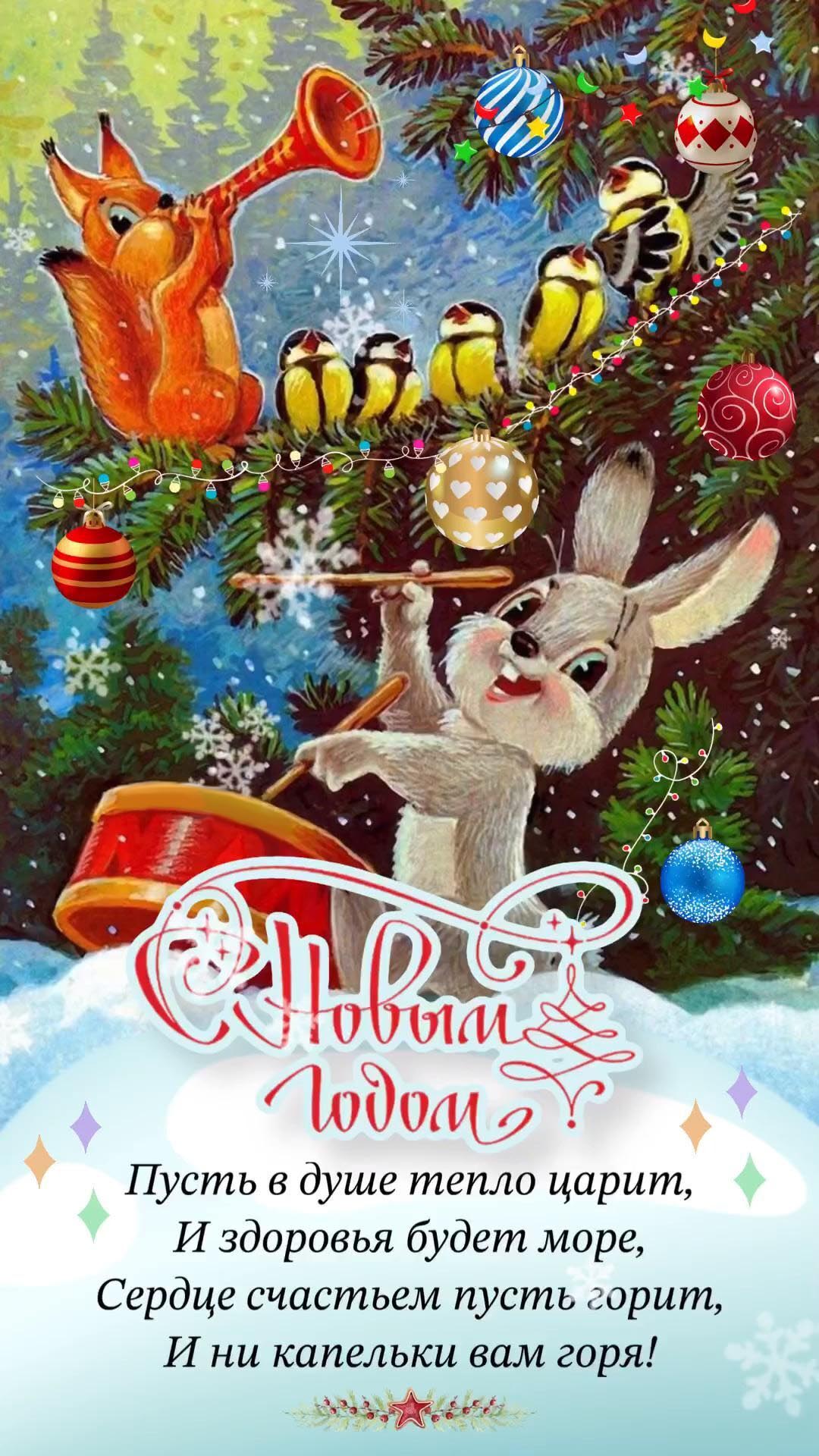Открытка с Новым годом. Ретро открытка старая советская. Зайчик и белочка у елочки. Пожелания.