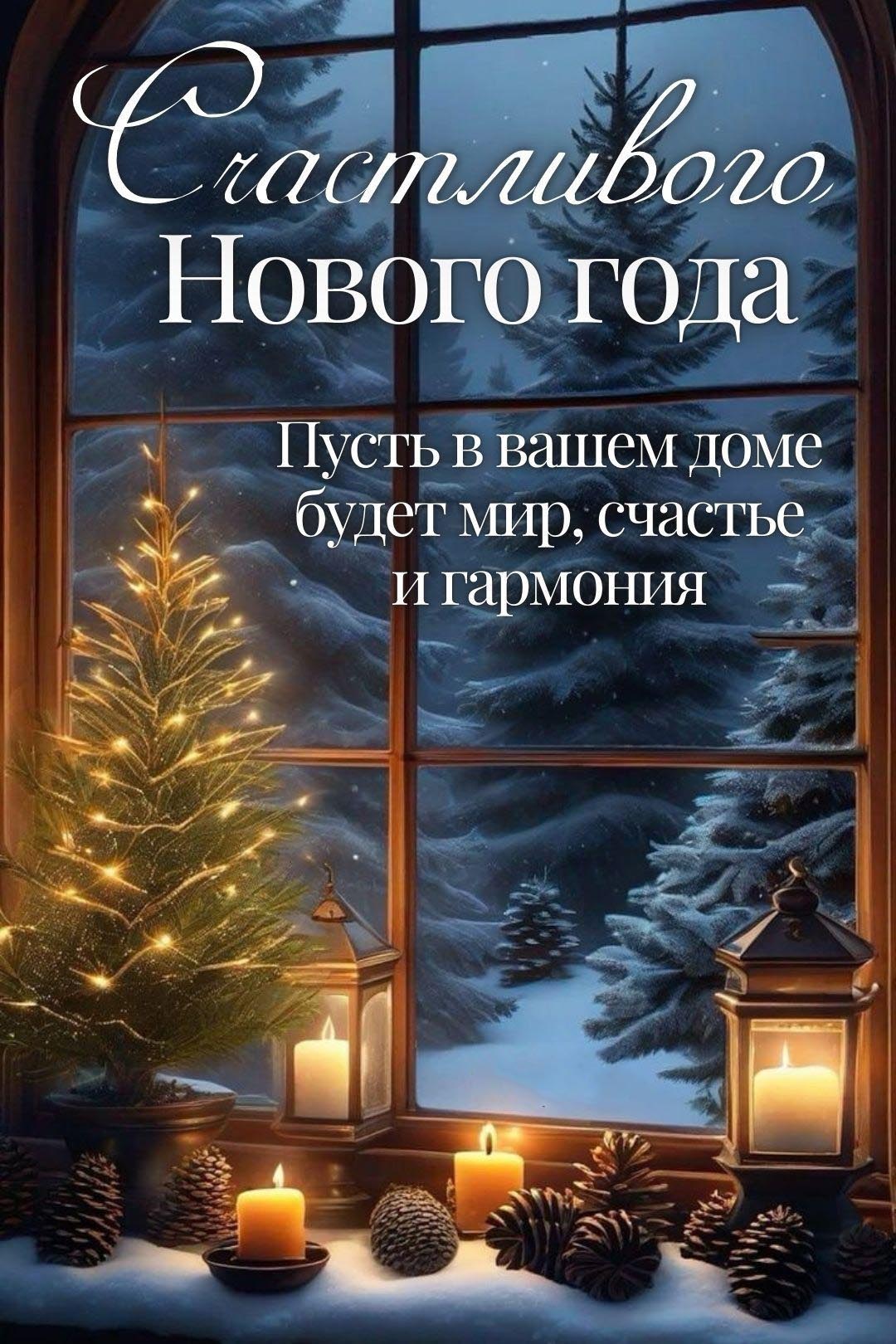 Открытка с Новым годом. Счастливого Нового года! Окно с елочкой, а за окном - заснеженные ели.