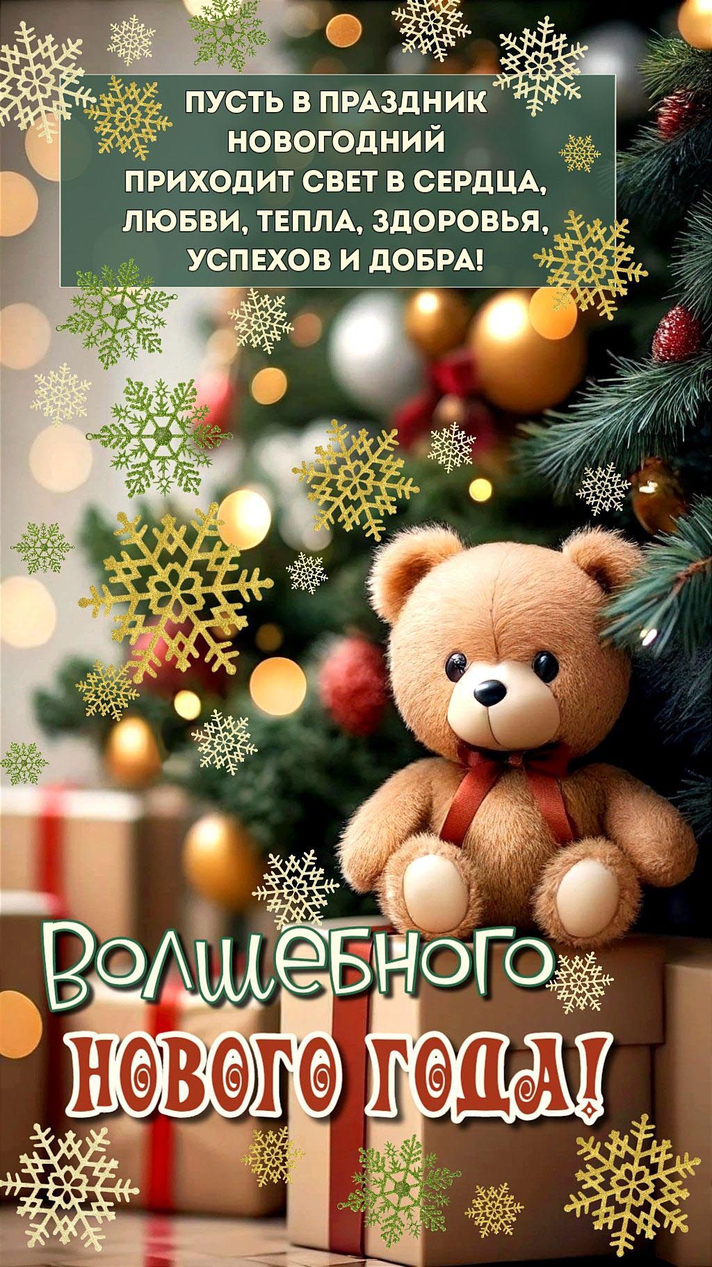 Открытка с Новым годом. Волшебного Нового года! Мишка, снежинки, подарки.