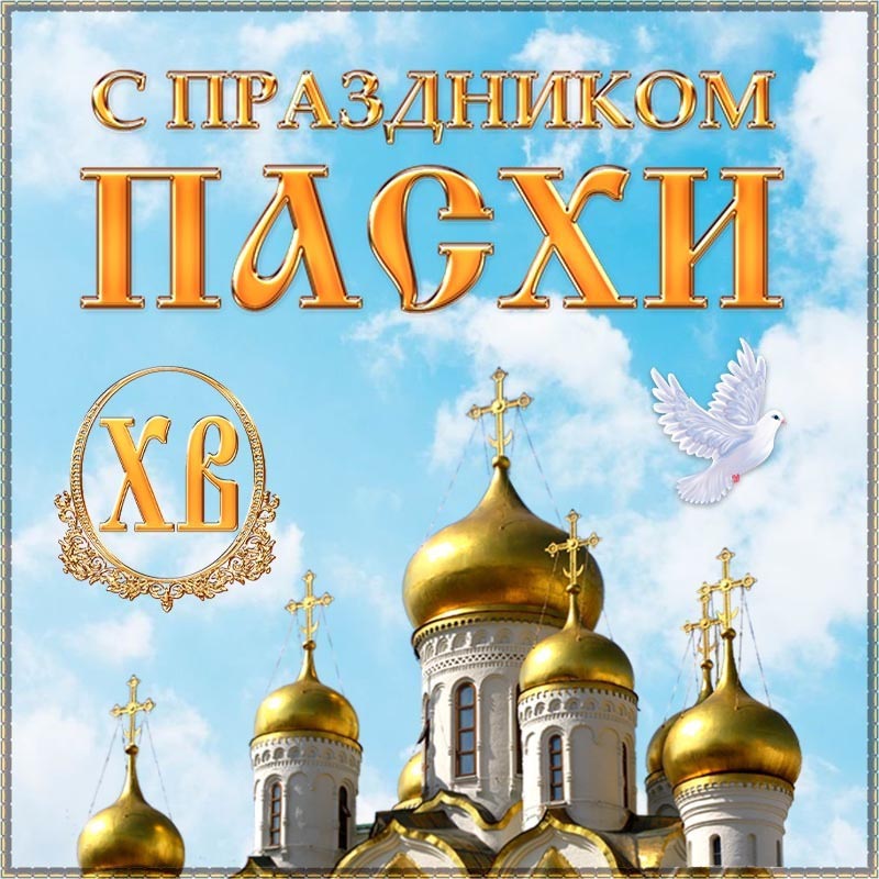 Открытка с Пасхой. Золотые купола, голубь и текст - с праздником Пасхи.