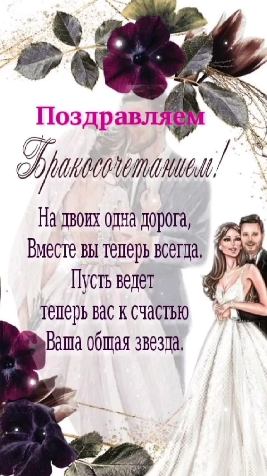 Открытка с поздравлением с бракосочетанием. Цветы и поздравление, жених и невеста.